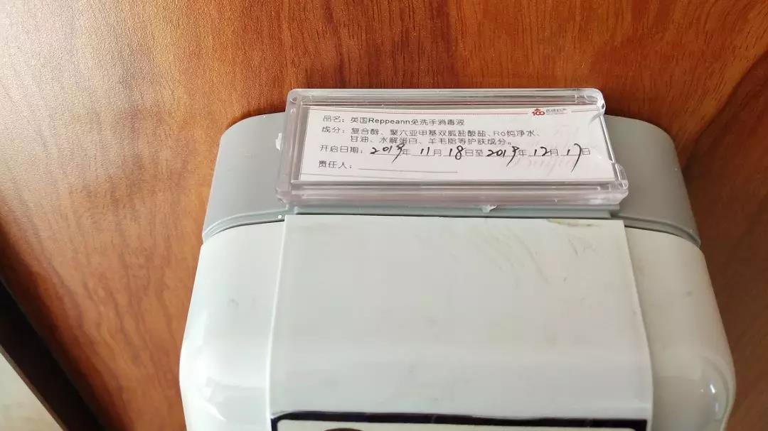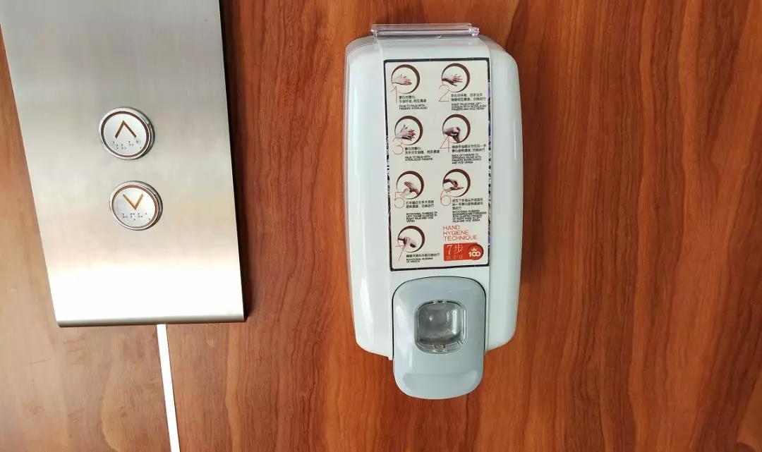每层电梯口设有免水洗净手消毒液,而且定期更换。
