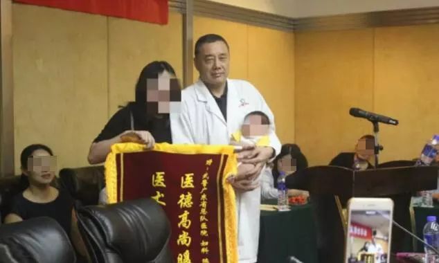 (宝妈携2个月的宝宝为陈建明主任送锦旗并合影留念)