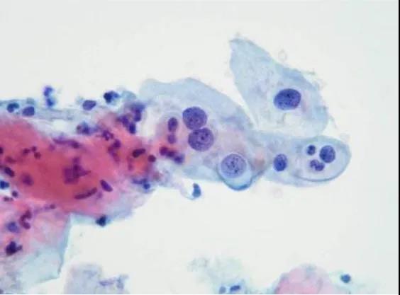 检查报告上经常可以看到的”红蓝相间“,即染色后的宫颈细胞