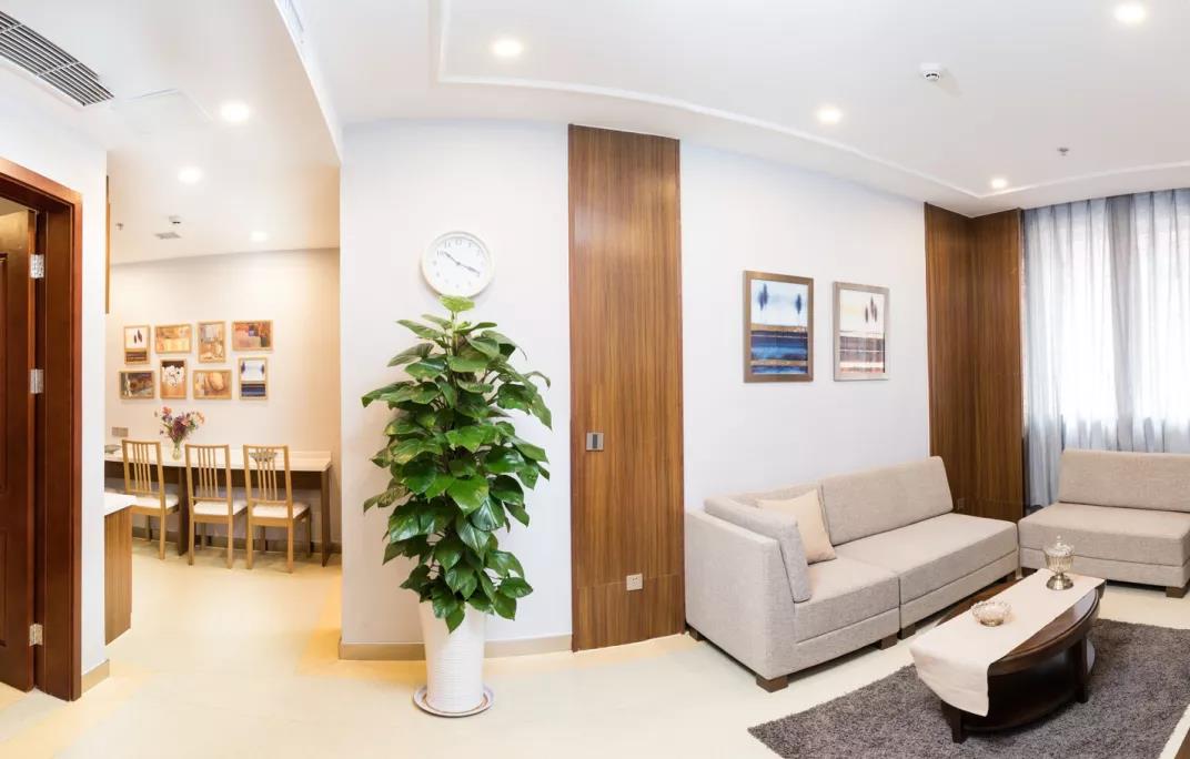 因为妈妈们才生产完较为虚弱,洗澡间里的无障碍防滑折叠凳简直是又一暖心细节,对于妈妈们是各种小心呵护宠爱!(同样还有紧急呼叫按钮,为各种紧急情况出现准备妥当)马桶旁的紧急呼叫按钮,就问你,这种达到医疗监护级别的月子照护,想得这么周到,你住的放不放心!!!这是套房的客厅,麻雀虽小五脏俱全呀,如同在家居住一般方便。