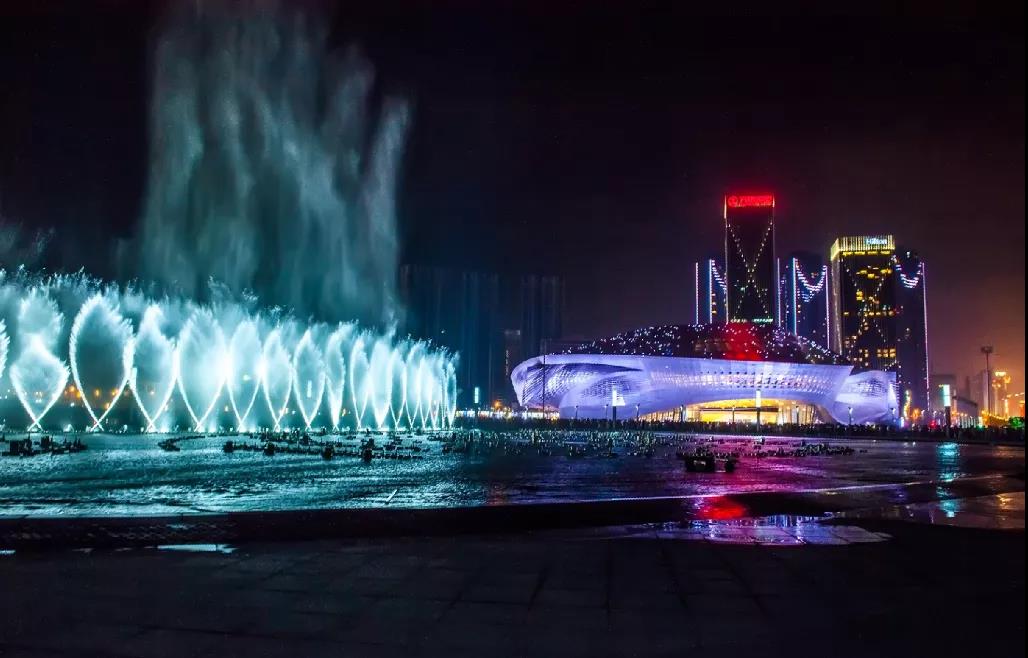 整个喷泉以大海、潮水为背景,与璀璨夺目的大连新百佳会议中心互为映衬。当夜幕降临,水声、音乐声、涛声与变幻的激光彩灯融为一体,气势磅礴。身临其境,如走入人间仙境,是一种让人屏住呼吸的美~