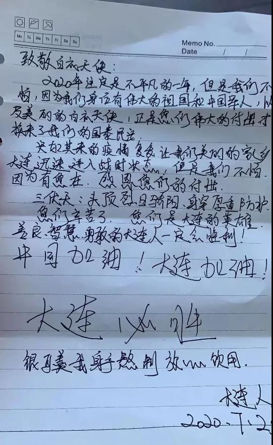 看到医护们这么辛苦,很多市民自发送来水、雪糕等消暑食品,一位20多岁的大连小伙,亲自送来熬好的粥和纸条,没说几句就走了,这是一颗大连人的真心:”银耳羹我亲手熬制放心饮用”