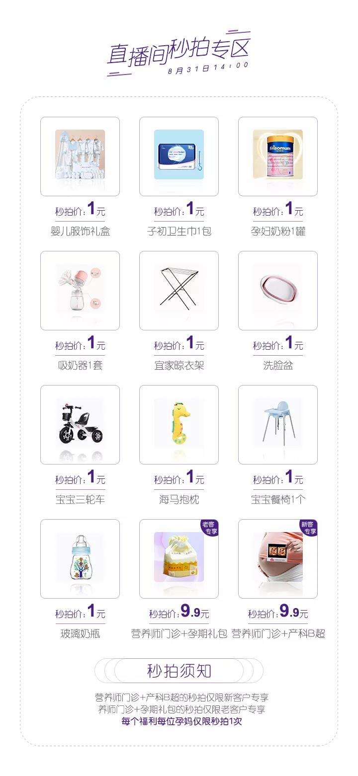 这场直播很走心有木有,不仅如此,还有更多惊喜等着你,宜家晾衣架,宝宝餐椅……,超多母婴用品,8月31日直播间均是1元抢购,所以,孕妈妈们定好闹钟了吗?