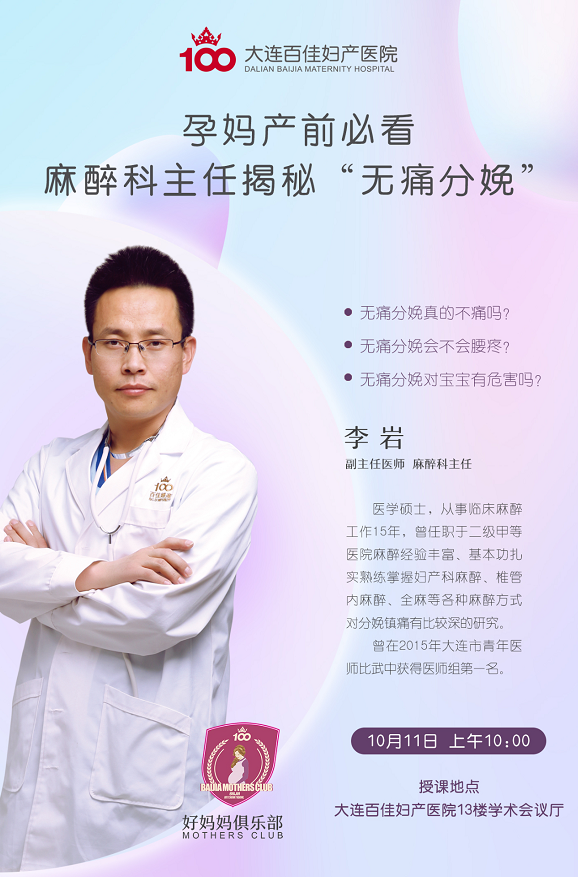 10月11日上午10:00,大连新百佳妇儿医院麻醉科主任李岩,为您揭开无痛分娩的神秘面纱,告诉您一个真实的无痛分娩全过程!