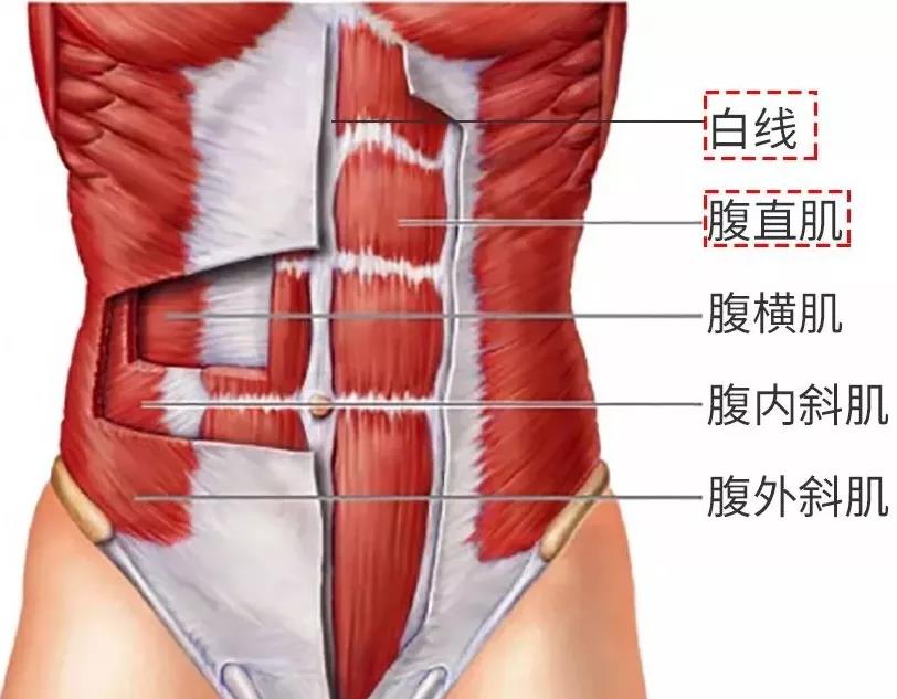 腹直肌分离......腹直肌位于我们人体腹部前侧,从胸腔下部连接到骨盆前侧的耻骨位置,肌纤维垂直走向,正常的腹直肌由横向的腱划分左右4块,中间有一条白色的纤维,称为腹白线。