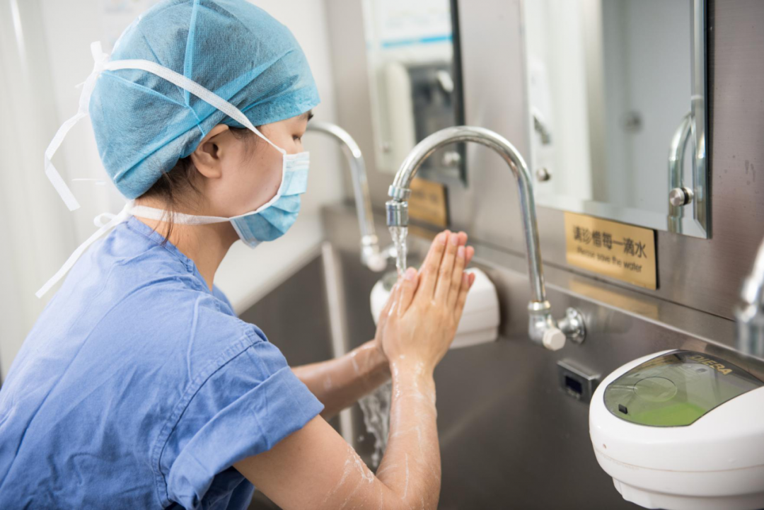 医生在做手术之前洗手是非常关键的一个步骤,七步洗手法认真清洁完毕后,还需规范手消才算完成这个环节。