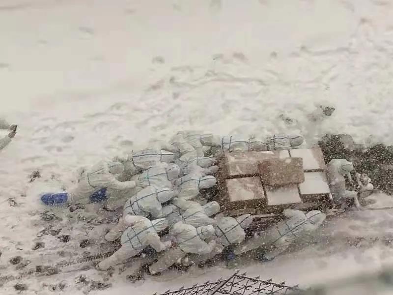 在漫天飞雪中,大连海洋大雪的抗疫志愿者们,推着配送的防疫物资,逆风前行