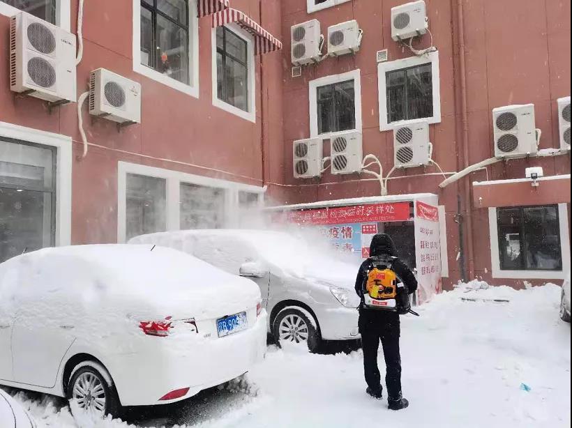 在没采购吹雪机之前,安保人员认真扫落每一辆,客户车窗上的积雪,保证视野清晰,开车更安全