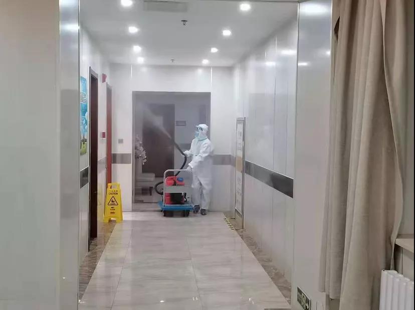 大连新百佳妇儿医院在保证在院人员安全的前提下,增加消毒频次,消毒面积覆盖全院。病区和所有公区每天不少于两次彻底消毒,对于使用频繁的公共区域,如电梯(包括电梯内外的按钮)、卫生间等,每2小时进行一次全面消毒。