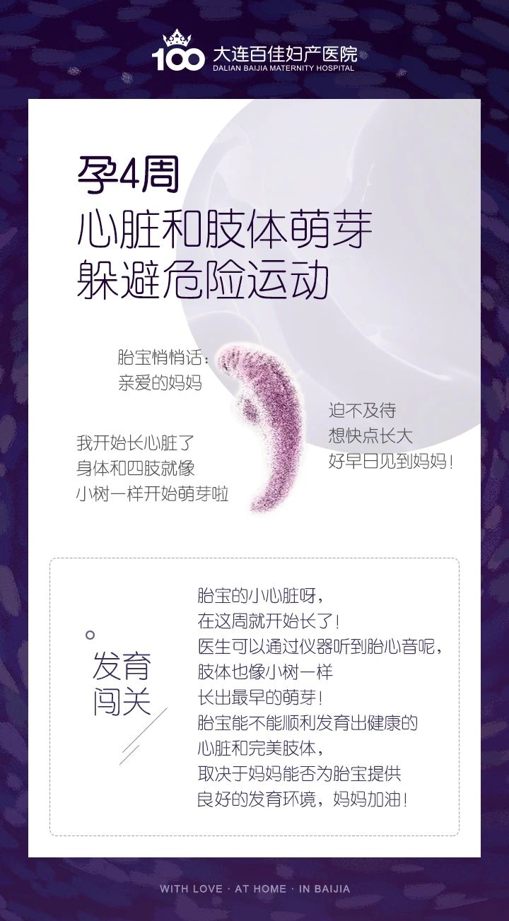 大连新百佳妇儿医院妈妈孕周闯关系列画报!孕四周——这个时期很重要!大连新百佳妇儿医院产科医生王宪带您了解,怀孕4周的孕期症状:进入第4周了,你可能还没有什么感觉,而胚芽已经悄悄地在你的子宫里”着床“了!你这个准妈妈还没发现身体的变化吧?现在你的子宫内膜受到卵巢分泌的激素影响,变得肥厚松软而且富有营养,血管轻轻扩张,水分充足,受精卵不断分裂细胞,移入子宫腔后形成一个实心细胞团,称为桑胚体,这时受精卵就叫胚泡。