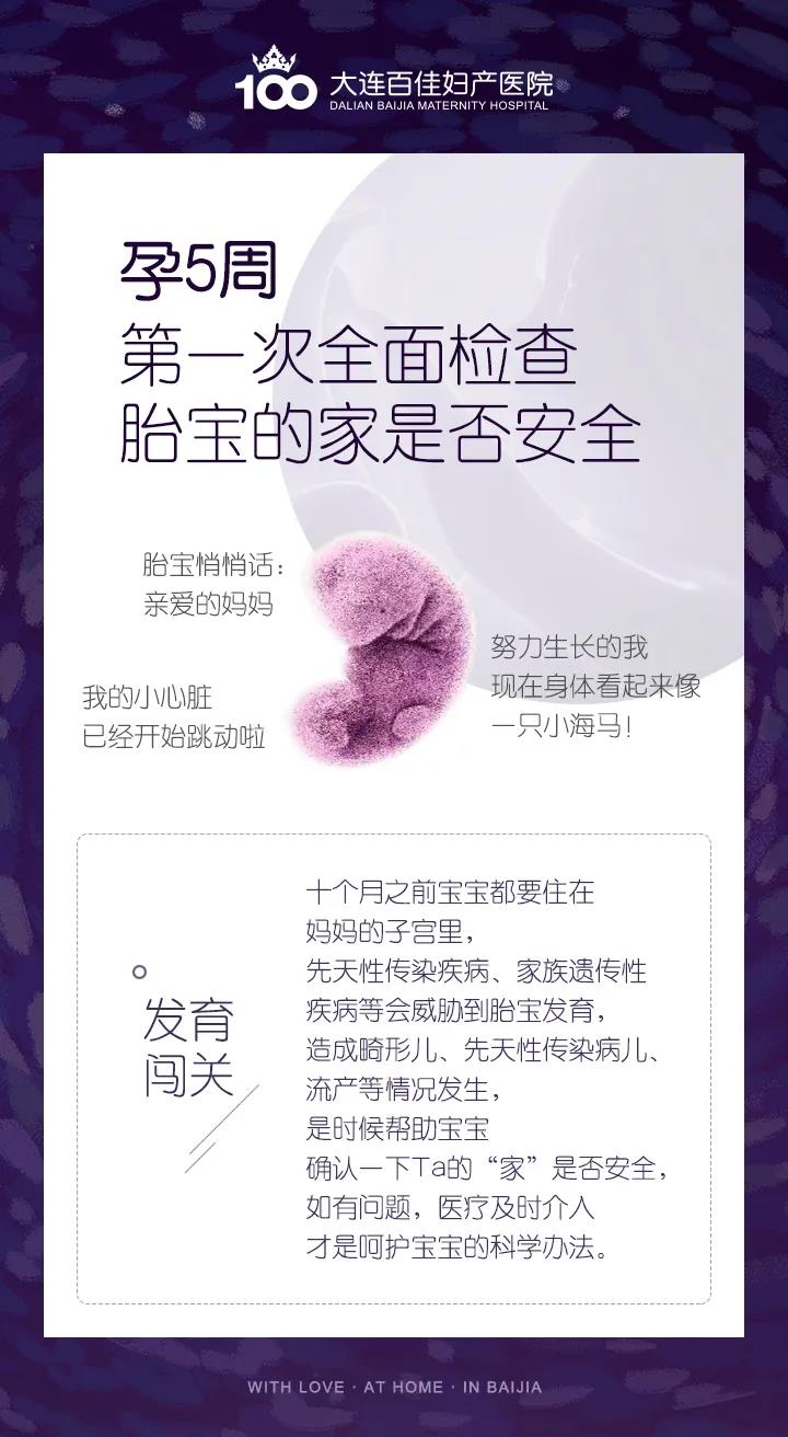 大连新百佳妇儿医院产检如何预约?百佳妈妈孕周闯关系列画报暖心上线!孕5周悄悄发出到来的信号,大连新百佳妇儿医院带您了解,怀孕5周的孕期症状:第5周,从外表来看,别人还很难看出你已经是孕妈妈了,但是实际上,在你的子宫里胚胎却在迅速的生长。现在,胚胎大概有0.6厘米长,像小苹果籽一样。