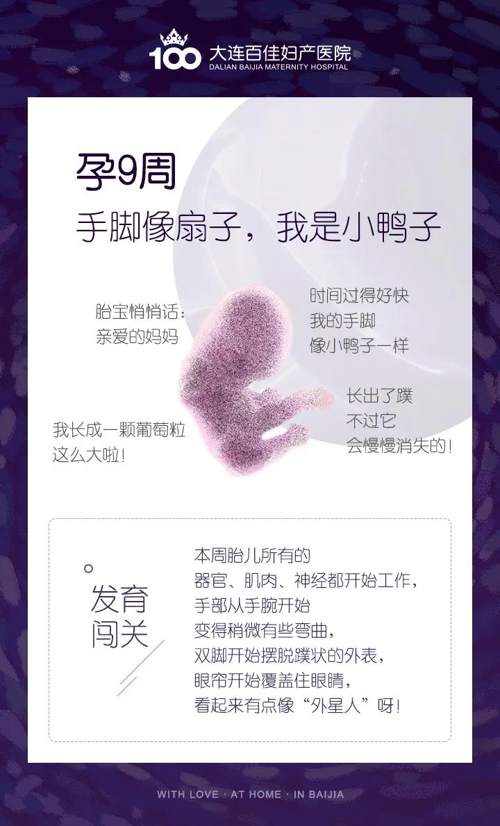 大连产科医院哪家好?大连新百佳妇儿妈妈孕周闯关系列画报!大连新百佳妇儿医院产科医生王宪带您了解,孕9周那些事儿!怀孕9周的孕期症状:从第9周开始胚胎已经可以称为胎儿了,宝宝从头部到臀部长22~30毫米,胎儿的许多位置发生了变化,胚胎期小尾巴在这时候消失,现在所有的神经肌肉器官都开始工作了;这一周你的早孕反应似乎更厉害了,体重也开始增加。