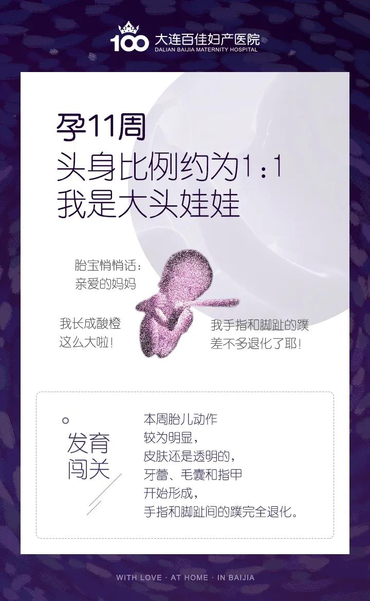 大连产科哪家医院好?大连新百佳妇儿医院孕周闯关系列画报!大连新百佳妇儿医院产科医生带您了解,怀孕11周的孕期症状:这周你的孕期反应没那么强烈了,小宝宝已经在你的子宫内开始做吸吮、吞咽和踢腿的动作,手指甲和头发也已经出现,这是宝宝骨骼形成、发育最旺盛的时期。在这个阶段,你要注意孕期补钙,用最舒适的心情等待宝宝茁壮成长吧!