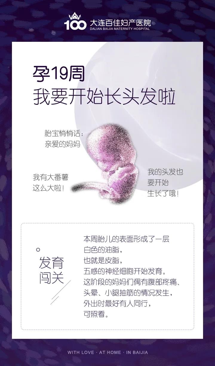 怀孕19周需要注意什么?大连哪家妇产医院好?大连新百佳妇儿医院产科医生王宪带您了解,胎儿发育在第十九周,宝宝的皮肤开始被一层滑滑的、白色的脂肪状外膜所包覆,这称为胎儿皮脂。胎儿皮脂可以保护宝宝细致的皮肤,让皮肤不会龟裂或刮伤。在胎儿皮脂下是柔细如羽绒般的毛发称之为胎毛,胎毛会覆满宝宝的皮肤。