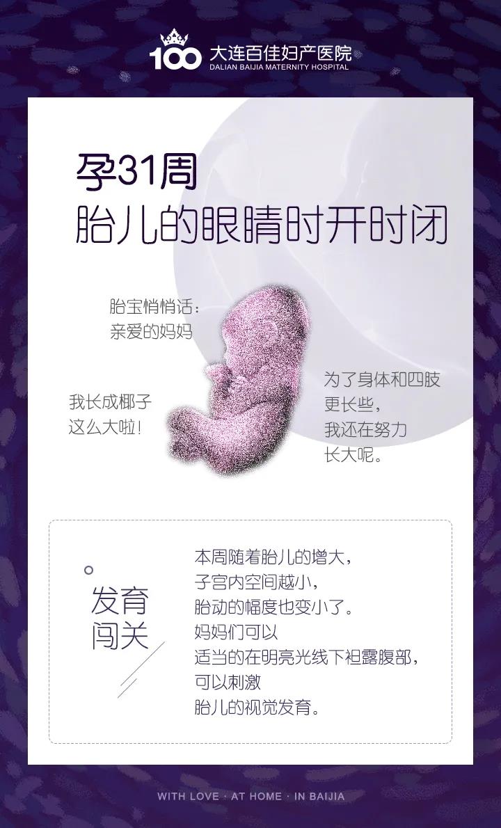 大连新百佳妇儿医院孕31周检查多少钱?大连产科医院哪家好?大连新百佳妇儿医院产科医生王宪带您了解,胎儿发育进入31周后,胎宝宝的肺部和消化系统已基本发育完成,身长增长减慢而体重迅速增加。胎宝宝周围大约有850毫升的羊水。随着胎儿的增大,宝宝在子宫内的活动空间越来越小了,胎动也有所减少。这周胎儿的眼睛时开时闭,大概能够看到子宫里的景象,也能辨别明暗,甚至能跟踪光源。