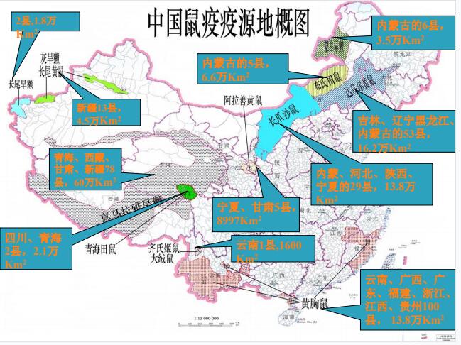 我国目前存在着12种类型鼠疫自然疫源地,分布于19个省区。