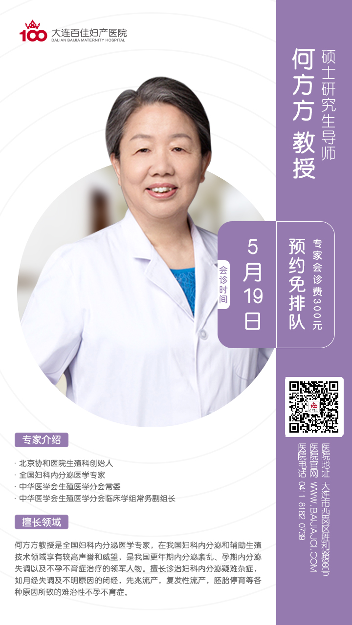 为方便广大滨城女性,何方方教授将定期在百佳会诊:从备孕、不孕不育到更年期等妇科内分泌疑难杂症,已经为多位患者制定了治疗方案,指明了治疗方向,并收到了良好的反馈。