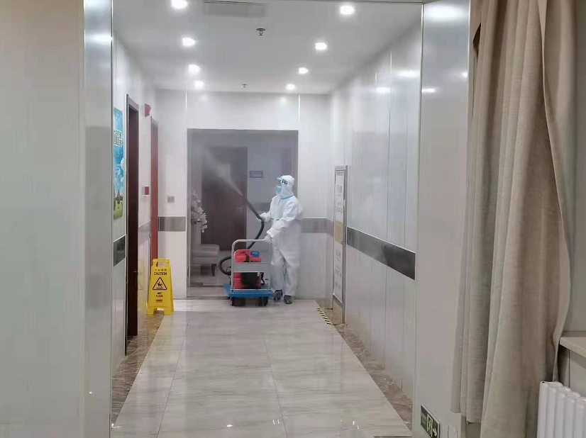 医院在保证在院人员安全的前提下,增加消毒频次,消毒面积覆盖全院。病区和所有公区每天不少于两次彻底消毒,对于使用频繁的公共区域,如电梯(包括电梯内外的按钮)、卫生间等,每2小时进行一次全面消毒。