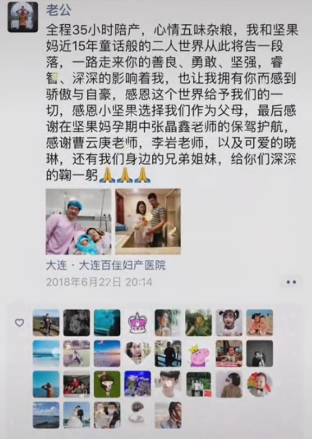 ”全程35小时陪产心情五味杂陈,我和坚果妈近15年童话般的二人世界,从此将告一段落,一路走来你的善良勇敢、坚强、睿智,深深的影响着我,也让我拥有你而感到骄傲与自豪,感恩小坚果选择我们作为父母,最后感谢在坚果妈孕期中张晶鑫老师的保驾护航,感谢曹云庚老师李岩老师......“