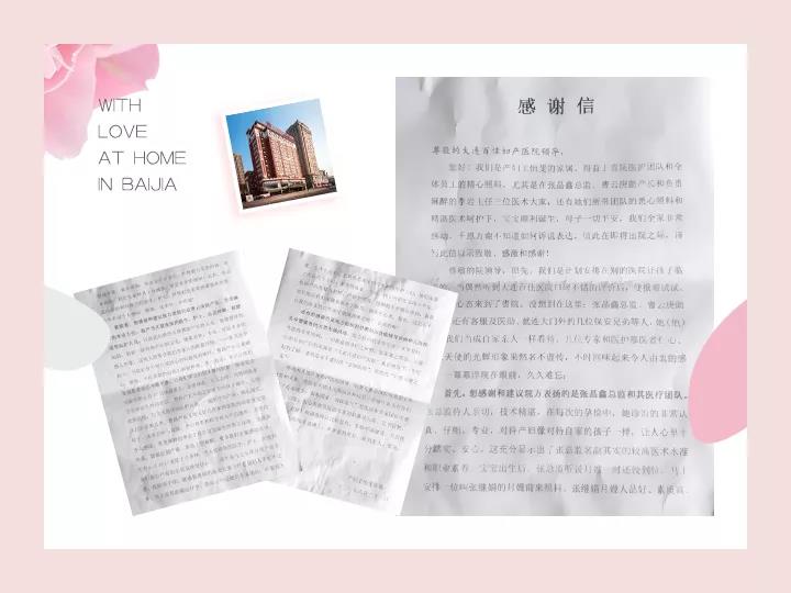 张晶鑫总监、曹云庚助产长和负责麻醉的李岩主任三位医术大家,还有她们所带团队的悉心照料和精湛医术呵护下,宝宝顺利诞生,母子一切平安。我们全家非常感动,千恩万谢不知道如何诉说表达。值此在即将出院之际,谨写此信以示致敬、感激和感谢!