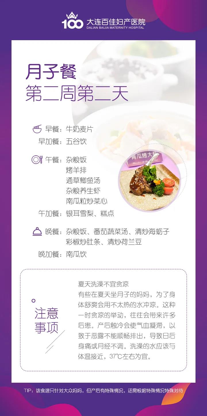 大连新百佳妇儿医院产后康复哪家好?夏季坐月子的注意事项有哪些?大连新百佳妇儿医院产科医生带您了解,第二周第二天月子餐食谱建议,注:该食谱只针对大众产后妈妈,若产后有特殊情况,还需根据特殊情况进行食谱调整。若您有需要可点击在线客服、预约营养师门诊。