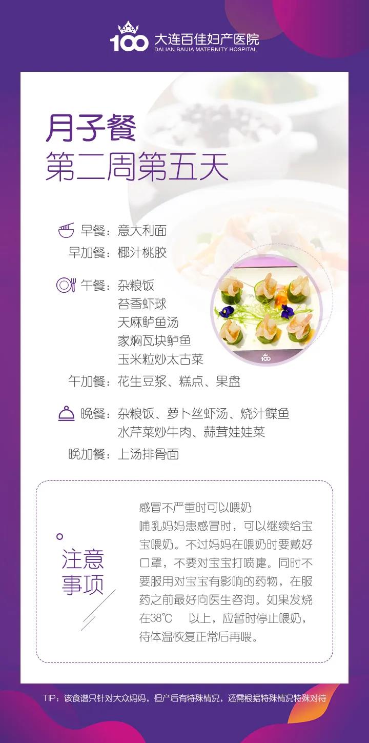 大连新百佳妇儿医院产后月子餐怎么吃?产后第二周第五天怎么吃?大连新百佳妇儿医院产后康复营养师带您了解,第二周第五天月子餐食谱建议