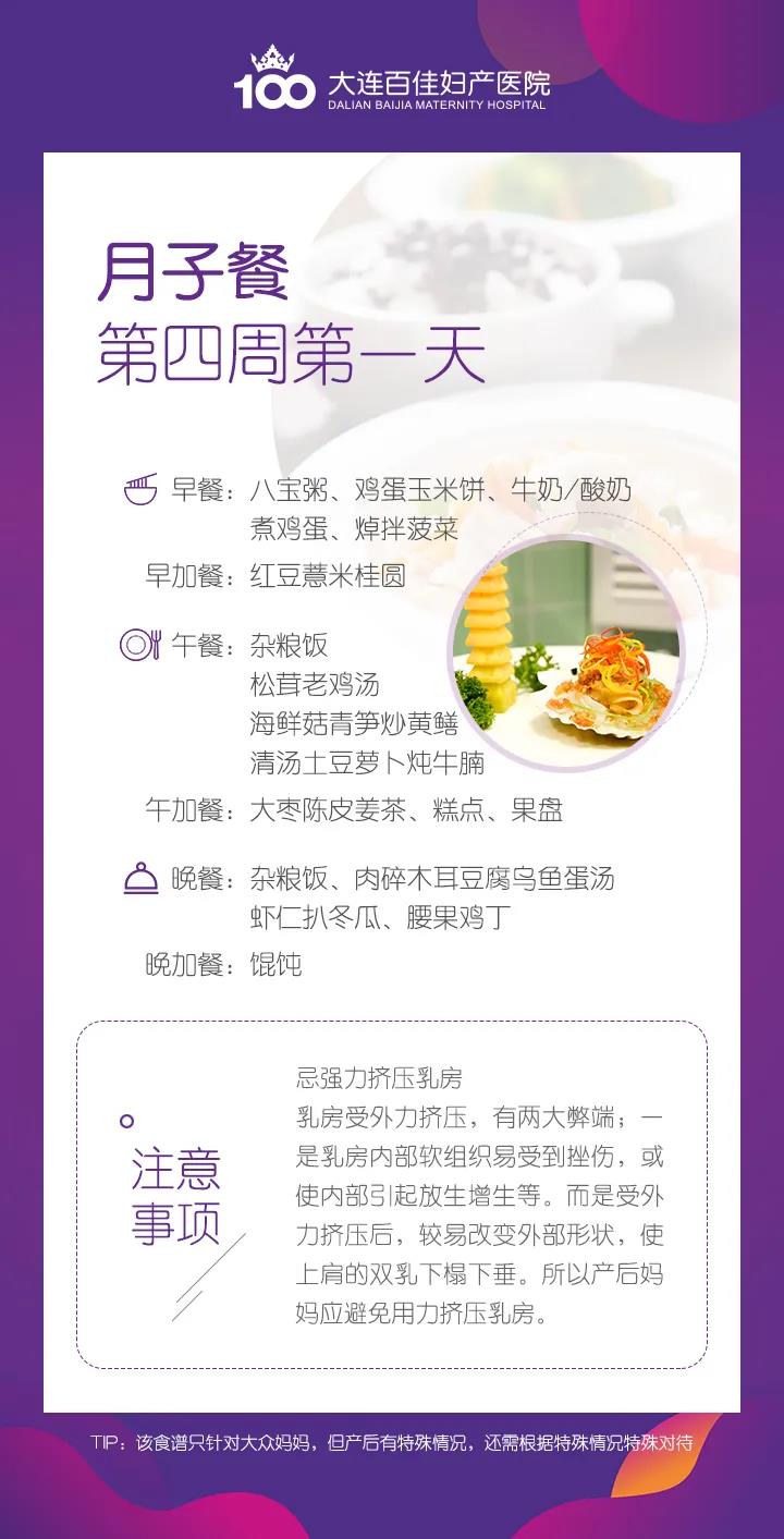 月子餐怎么吃,大连新百佳妇儿第四周第一天怎么吃?该食谱只针对大众产后妈妈,若产后有特殊情况,还需根据特殊情况进行食谱调整。