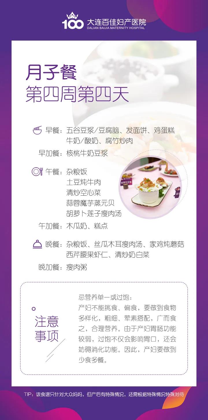 第四周第四天怎么吃?大连产后修复医院_大连新百佳妇儿医院。第四周第四天月子餐食谱建议,大连新百佳妇儿医院表示,该食谱只针对大众产后妈妈,若产后有特殊情况,还需根据特殊情况进行食谱调整。