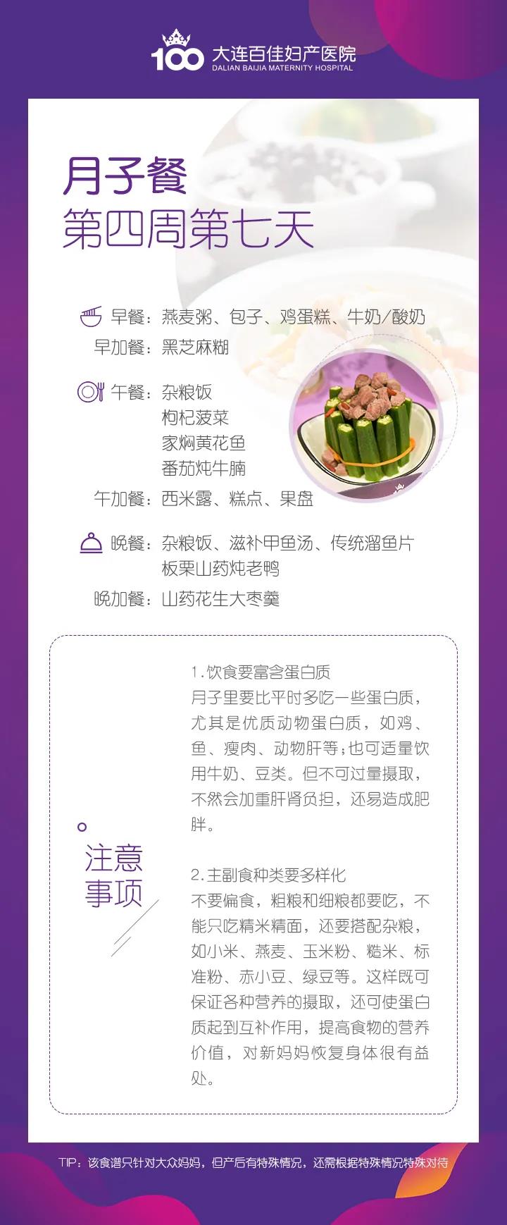 大连新百佳妇儿医院月子营养师推荐月子餐_第四周第七天怎么吃?大连新百佳妇儿医院产科带您了解,该食谱只针对大众产后妈妈,若产后有特殊情况,还需根据特殊情况进行食谱调整。