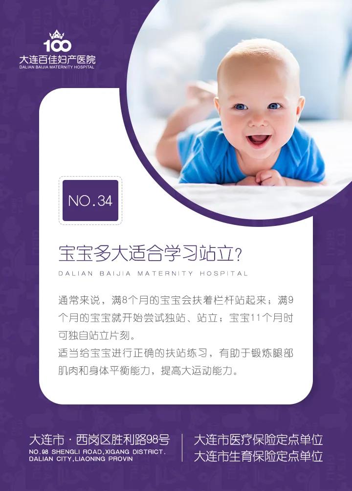 大连新百佳妇儿医院儿科体检费用_宝宝多大适合学习站立?大连新百佳妇儿医院儿科医生带您了解,当月龄到9-10个月时,大多数宝宝都能抓着东西站立或独自站立。这个时候爸妈们可以做一些事情来辅助宝宝学习站立,比如当宝宝在尝试站立的时候,仔细观察一下周围有没有尖锐的东西,以免在宝宝站立不稳摔倒的时候受伤。