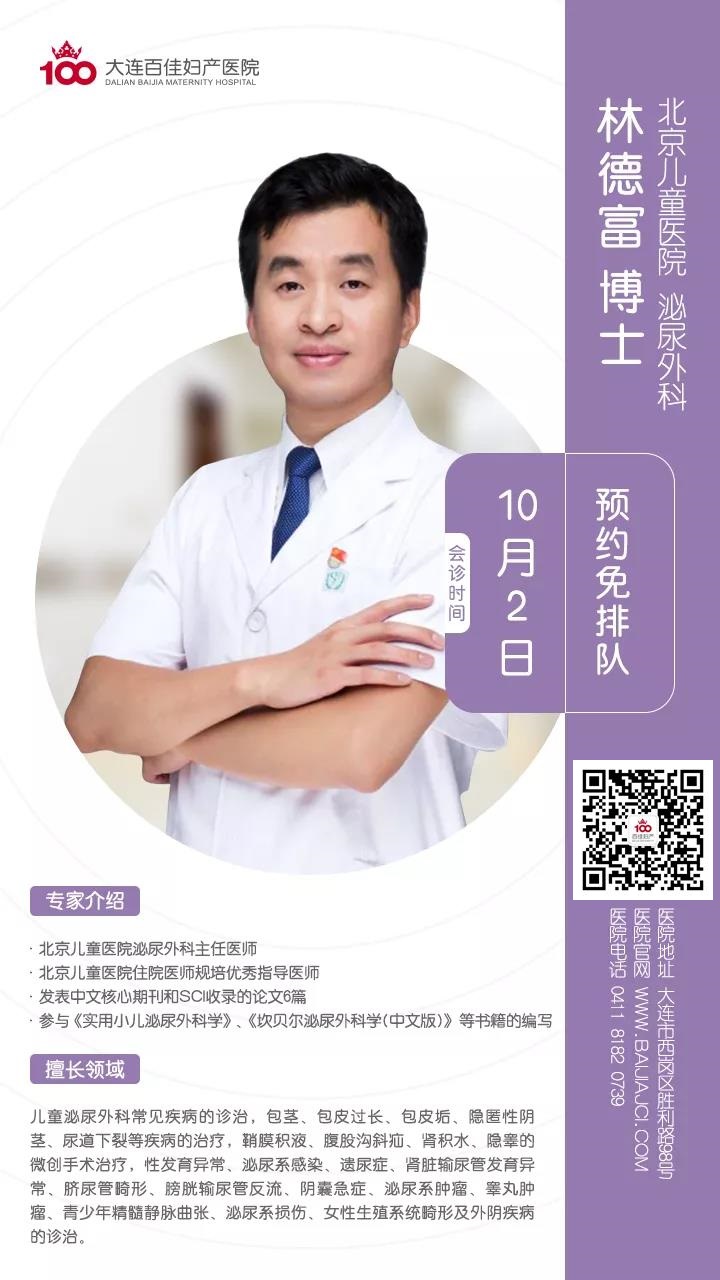 10月2日首都医科大学附属北京儿童医院,林德富博士,将亲临大连新百佳会诊,应用”精细化包皮环切术“帮助男宝轻松安全完成”丁丁历险记“