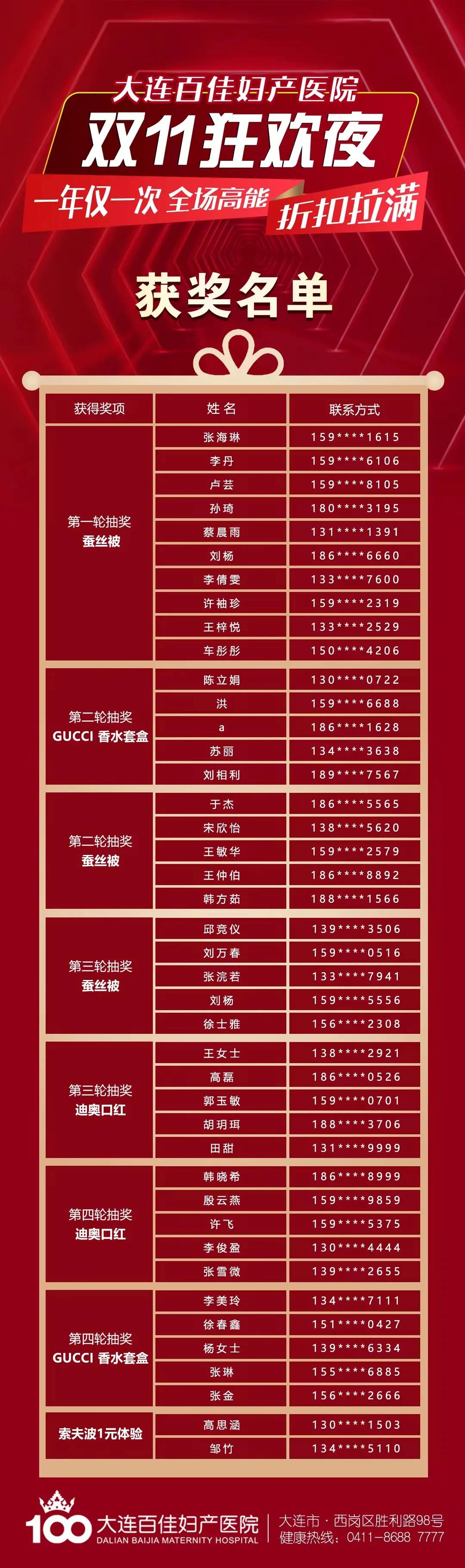 大连新百佳妇儿医院双11狂欢夜中奖名单已公布~快来看看锦鲤是你吗?